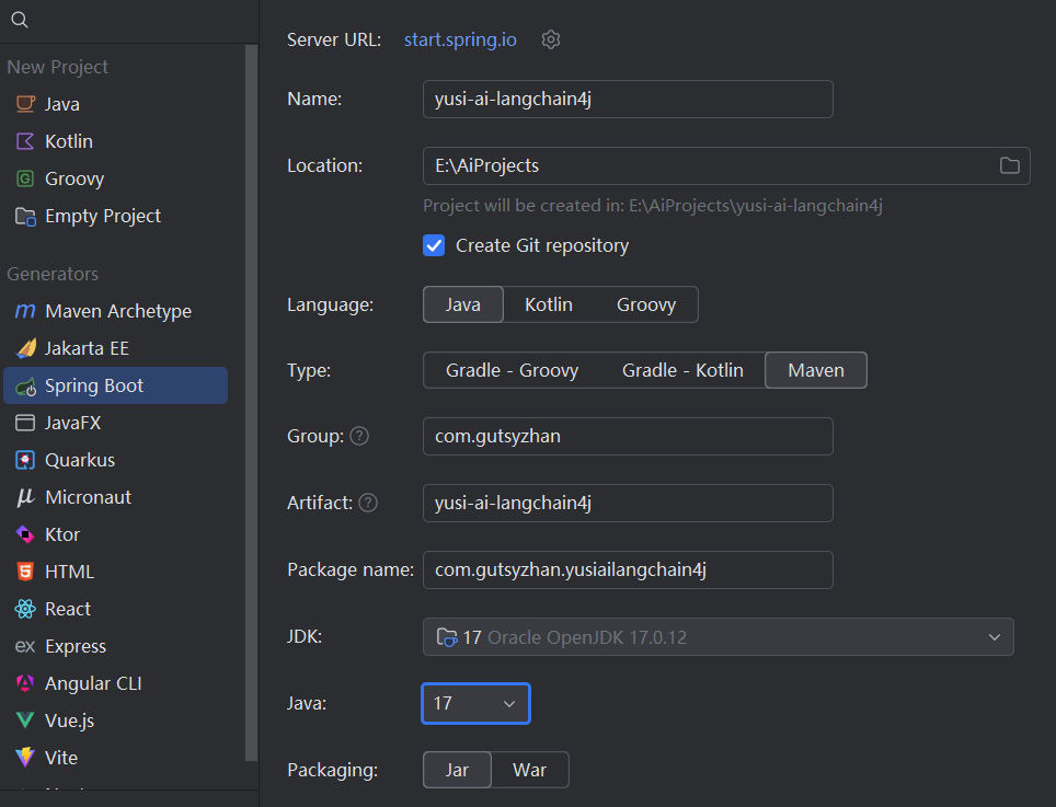第一步,创建一个名为yusi-ai-langchain4j的项目: