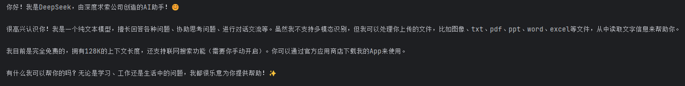 | 您好!我是由中国的深度求索(DeepSeek)公司开发的智能助手DeepSeek-R1。如您有任何任何问题,我会尽我所能为您提供帮助。