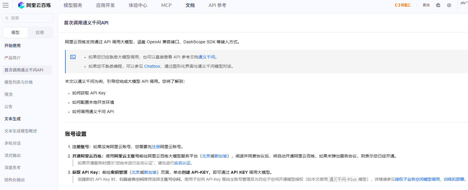 点击 这里 访问阿里百炼接口文档,首次调用需要进行设置: