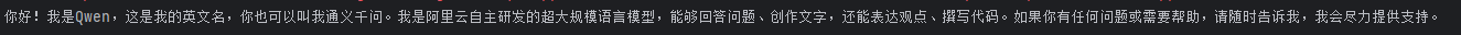 /** * Qwen语言模型接入测试 */ @Test void contextQwen() { //向模型提问 String answer = qwenChatModel.chat("你好,你是谁?"); //输出结果 System.out.println(answer); } }