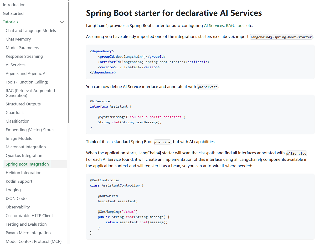 点击 这里,查看与SpringBoot的集成,这是langchain4j的高级功能: