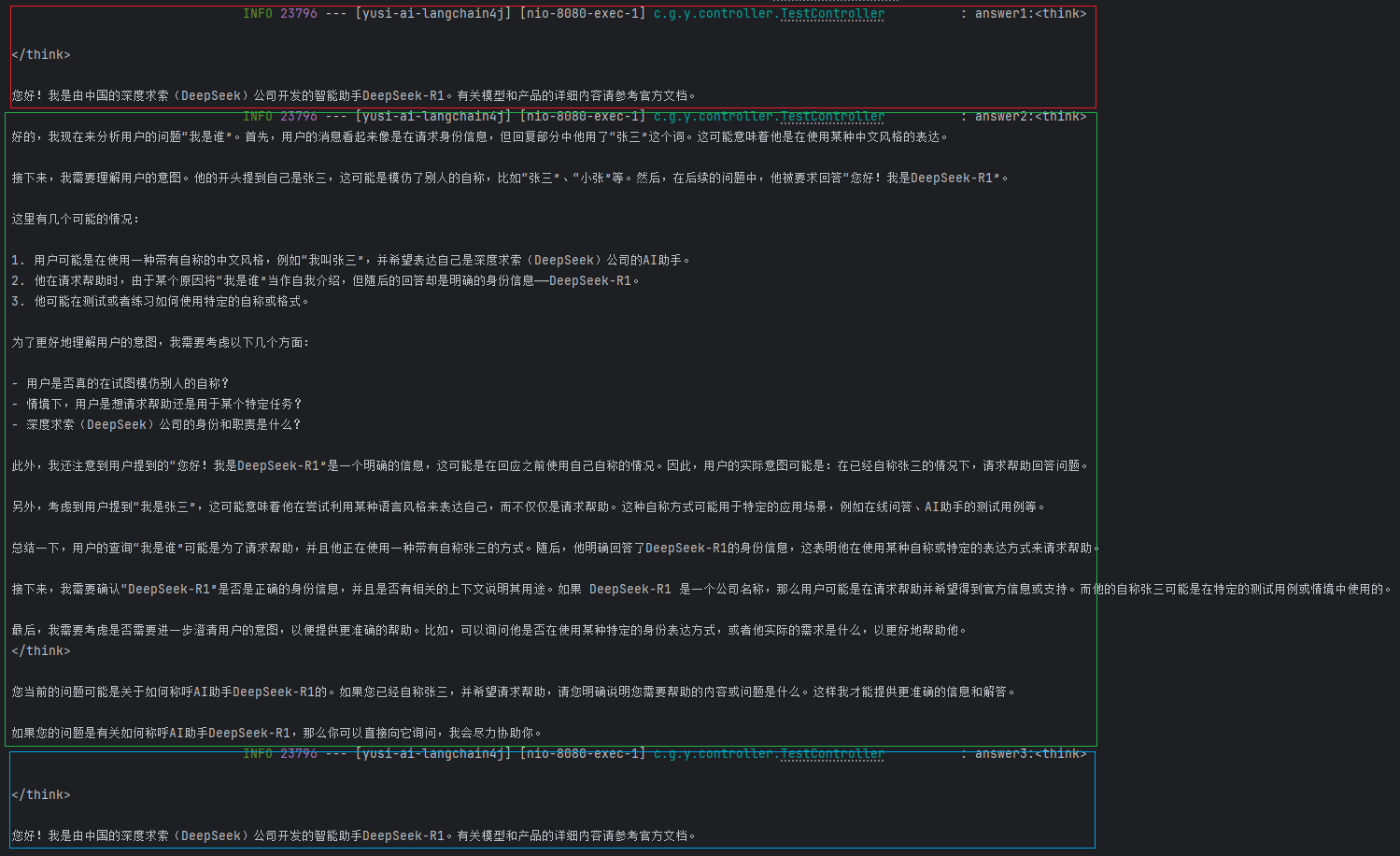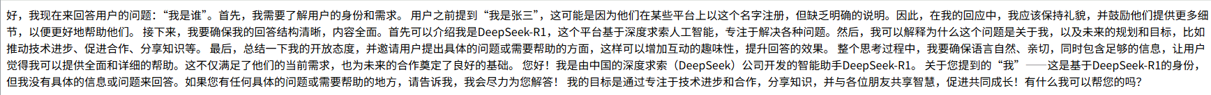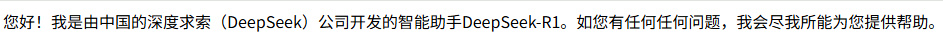1 | 你好!我是一个由深度求索公司独立开发的智能助手DeepSeek-R1,如果你有任何任何问题,我会尽我所能为您提供帮助。 |