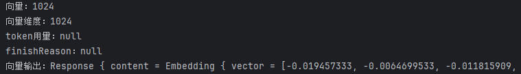 /** * 测试向量模型 */ @GetMapping("/testEmbeddingModel") public String testEmbeddingModel(){ String text = "你好"; Response<Embedding> response = embeddingModel.embed(text); log.info("向量:{}",response.content().vector().length); log.info("向量维度:{}",response.content().dimension()); log.info("token用量:{}",response.tokenUsage()); log.info("finishReason:{}",response.finishReason()); log.info("向量输出:{}" ,response); return response.toString(); } }